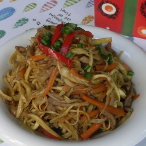 加老抽糖醋少量水加肉丝翻炒片刻起锅装盘洒上葱花。