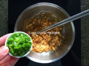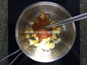 鸡蛋酱做的时候鸡蛋不是像我们平时炒鸡蛋似的煎成饼状,倒进去后立刻用筷子搅碎。要炒散,不要太碎,太碎口感不好。