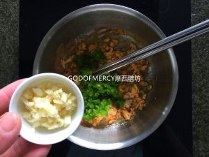 再放入大蒜翻炒一会儿。关火,用余温翻炒。看大酱水份差不多了就行了。