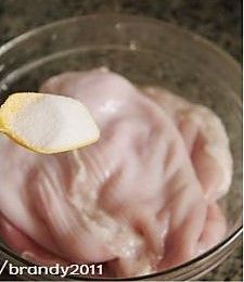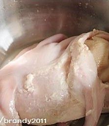 在加入盐三小勺,还是用两只手猛抓猪肚,抓呀抓,然后用自来水冲干净,反复这样的程序2-3次