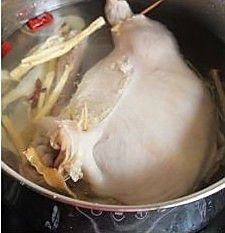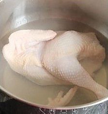 锅中放水,放入酿好的猪肚鸡,加几片姜片,少量料酒,先焯水一次