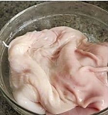 加入些白醋,用两只手猛抓猪肚,抓呀抓,然后用自来水冲干净,直到水很清澈,猪肚很干净ok,再翻回来。
