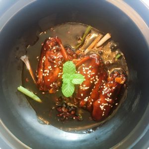 加入鸡翅,然后加花椒,八角,可以炒的时候加两勺醋