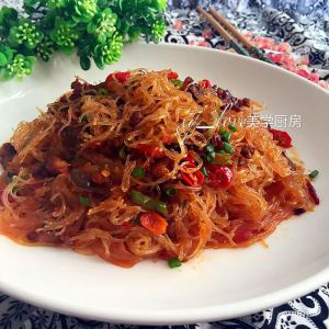 粉丝用剪刀剪断,一定要泡开哦,我基本泡了半个小时。粉丝沥水放入锅里小火煮开,加入少许盐,糖调味。之前豆瓣酱有了咸味,所以不需要放多盐,也不需要放酱油了