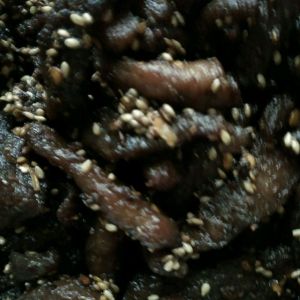 锅里留少些油放辣椒面炒香,牛肉倒入锅中,放孜然和炒过的芝麻,翻炒均匀后出锅。(图片拍的比较暗,因为下雨天:))