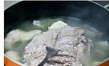 捞出羊肉,不要关火,加入泡发并撕成小朵的木耳和用温水泡好的粉丝,大火煮10分钟后调入白胡椒粉即成鲜美的羊肉汤