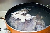 汤锅中注入约2/3满的清水,将冲洗干净的羊腩肉整块放进去,中火煮至沸腾后撇去浮沫