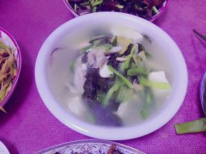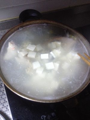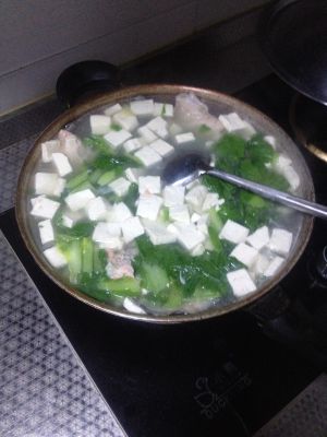 豆腐放入锅内锅开后放入小白菜熬~最后放点盐调味就OK了~小白菜熟后出锅就可以了~