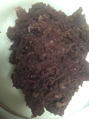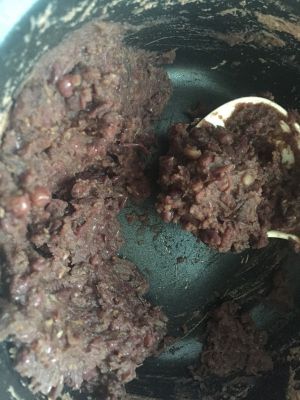将红豆,冰糖,去核后的红枣和三倍的水放入电饭煲,用煮饭模式煮一个多小时,待红豆煮软后用勺子碾压,再煮,中间若水不够继续加水,直到煮成图中的状态。