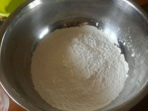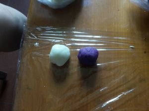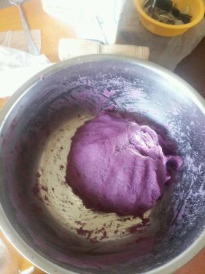 这时将紫薯削皮放入蒸锅蒸熟后加入适量的牛奶合成紫薯泥,装入保鲜袋放入冰箱。同时把一小碗糯米粉干炒至微黄(熟粉),留用