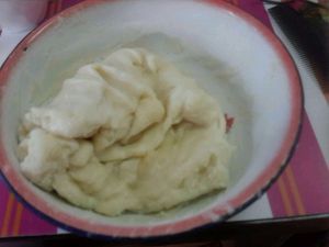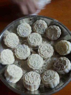 皮浆(3)静置30分钟后上锅蒸,蒸的时候在碗上盖上碟子防止气泡,蒸25分钟,拿出锅后乘热搅拌揉捏5分钟(这时候月饼皮很烫,用工具搅拌不要上手),微凉后揉成团后用保鲜袋装着放入冰箱1小时以上