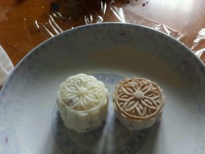 把揉圆的月饼放进模具中压成形,记得放熟粉,不然会黏在模具上(左边是忘了放粉比较白)