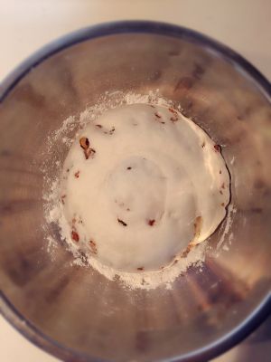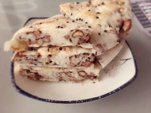 把核桃仁炒十分钟炒香掰碎混合熟黑芝麻待用,面粉加温水酵母揉成面团放温暖处发酵一小时。发酵好杆成两毫米圆形面片,将五香粉,盐,油混合均匀涂抹在面片上,撒上黑芝麻及核桃碎,慢慢从边缘卷起后再盘成圆饼,再放入盆中二次醒发(不好意思忘记拍照了