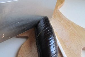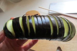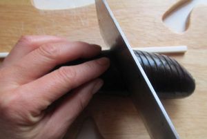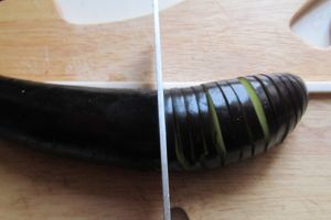 切好后换个方向,将底面未切的部分放上, 将刀与茄子垂直切下去,竹筷的还是摆在老地方,有了竹筷的帮忙,切到竹筷的地方就可以了,也能保证不切断。