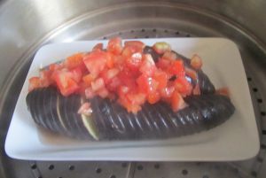 加入切好的番茄丁继续蒸上五分钟;再加入剁碎的蒜泥蒸上两分钟;