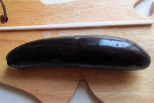 首先将洗净的长条茄放在案板上, 找个竹筷来, 它就是我们今天的重要工具, 将竹筷放在茄子的前面,准备工作就好了;