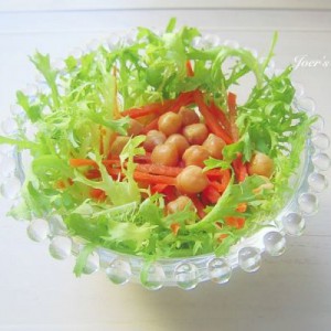 苦菊洗净,放入凉白开或纯净水里浸泡1分钟冲洗两遍控干,胡萝卜去皮切丝,混合煮好的鹰嘴豆。