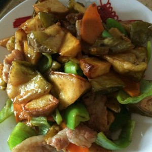 将炸好的茄子土豆倒入,翻炒