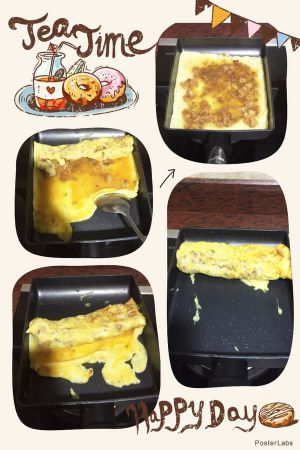 忘了拍下这次的煎煮过程,这里附上的图片是上次煎萝卜干玉子烧的过程。其过程是一样的,关键控制好火候,小火操作,蛋液稍微凝固的时候开始用勺子慢慢翻卷成形,然后煎至金黄熟透即可。锅子是网上购买的玉子烧专用锅。