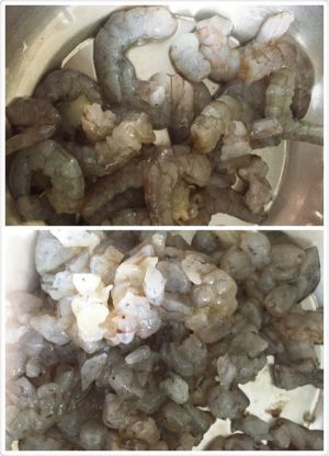 鲜虾剖壳挑出黑泥,用食用剪刀把虾剪碎。