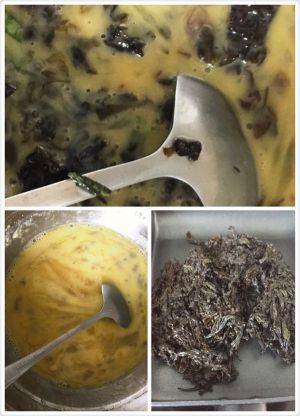 把烘烤好的紫菜剪碎加入蛋液里,再次搅拌均匀。