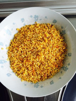 摘好后加入盐腌制15分钟左右,桂花我没有洗,因为头天晚上下过雨,我摘的是没有雨水在上面的,差不多都是才开没多久的,而且我怕洗后不想还怕有生水在上面不好保存