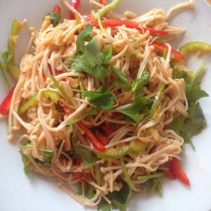 一盘促进食欲的彩椒凉拌金针菇出炉、喜欢辣的可以适量放入辣椒油、