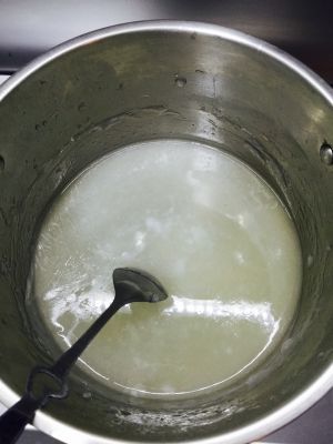 白凉粉、纯净水和白糖放入锅里烧开,一边搅拌至白糖融化,关火。