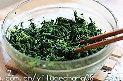 将草头取出用冷水冲一下,挤干水分切碎放入碗中,撒上适量盐和味精,菜油烧烫之后浇入碗中拌匀
