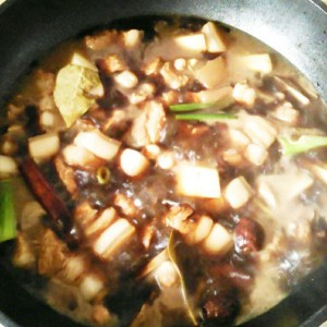 把备好的材料都放入锅中翻炒,放入生抽,再加水抹过肉,大火炖