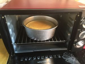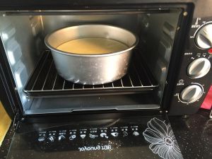下面是烤盘,烤盘里有水。中间是烤网。上面是蛋糕烤模。就是这样的顺序!然后130度烤一个小时!