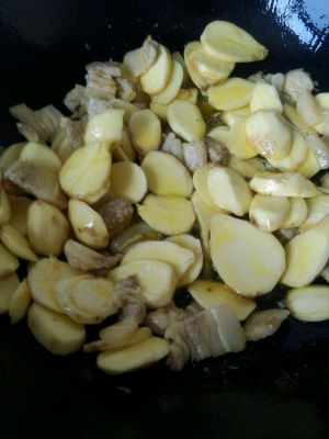 起锅倒食用油,油热了倒入五花肉片先炒并加料酒,五花肉熟了再加茨菇一起炒