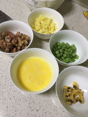 所有材料切粒,鸡蛋打散,蛤蜊干洗干净待用。