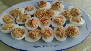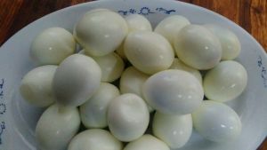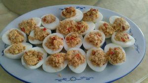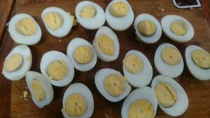 把鸡蛋黄鱼肉末塞进蛋白里即可