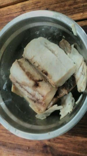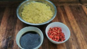 冷切后的鱼肉剁碎与揉碎的蛋黄放在一起,小米椒切碎待用。生抽,蚝油,姜末,料酒沙茶酱拌匀待用。