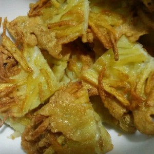 锅里放油,待油温热后,小火,用筷子夹拌好土豆丝放入锅里,用铲子摊平,小火煎炸,一面好后进行翻面。(因为鸡蛋液可能会导致和淀粉在一起时会有积水,这时放完土豆后浇在上面就可以)。