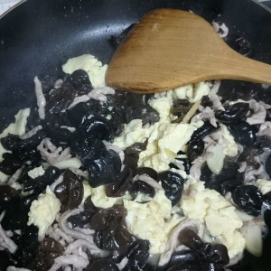 鸡蛋提前炒一下盛起来备用,然后下姜蒜下肉丝炒至变色,下木耳