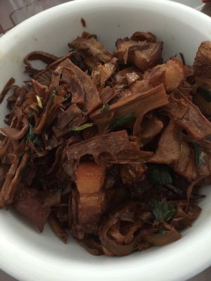 后翻锅,用筷子插下肉和笋干,肉烂了焖5分钟,后出锅。