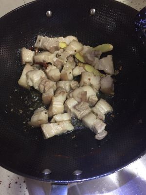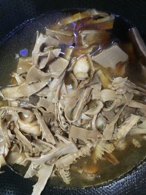 加入笋干翻炒后,加入黄酒,生抽,海鲜酱油,加适量的水,没过肉和笋干。中火炖40分钟。