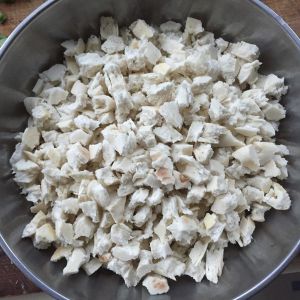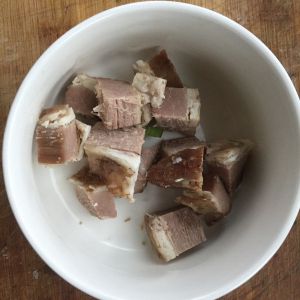 肉煮好后 从汤里捞出 空水晾凉 根据人头切成小块儿