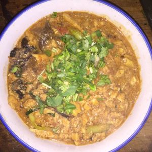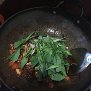 起锅放油开火 葱姜爆香后放入辣椒面 小火翻炒 之后先放入豆干 木耳 黄花菜,其后再倒入西红柿和之前加工好的牛肉块,加入青菜,加适量香醋翻炒