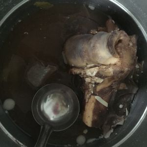 牛肉和棒骨放入锅中入水开煮 注意这时不要放任何调料 煮开后让水多滚几分钟 撇去血沫后 再放入大葱 生姜 炖肉料包(自己配调料包很麻烦,我直接用的市场上买的包装好的穆香堂的炖肉料,看了下配料和做泡馍汤的自配料成分比较接近 出来的味道也不错)