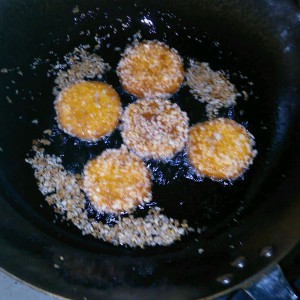 用手捏一个个的小饼状,然后外面弄一层面包糠。面包糠可以防止糯米粘锅