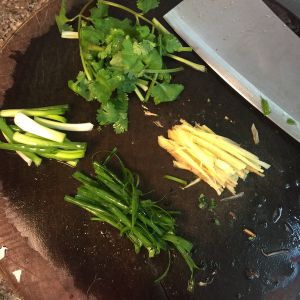铺上切好的香菜和葱丝,锅里入油,待热了以后,浇上油就好了