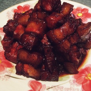 加水淹没过肉,加入冰糖、剩下的香叶,酱油,少许红曲粉(红曲粉的好处可多了,可以百度)大火煮到收汁,尝下味道,自行调节下~