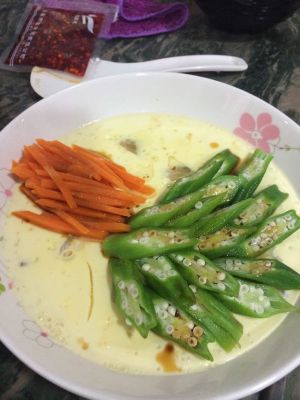 蒸蛋的时间,将两个秋葵和胡萝卜丝洗净焯水,水中滴两三滴食用油,色泽会更好,胡萝卜有油脂也更营养,焯熟的秋葵,斜刀切厚片备用!
