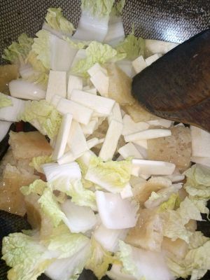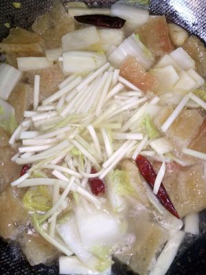 锅热油放入姜,蒜,辣椒爆香后放入肉皮炒一会,再放入菜帮,茭白炒软。