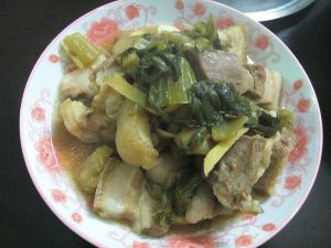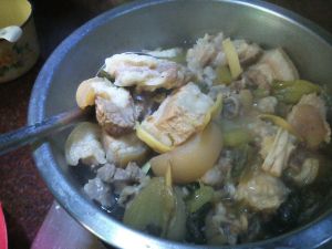 五花肉洗净切大块,猪蹄洗净,蒜拍碎连皮一起,姜切丝,咸菜切小块,所有材料一起放锅里加盐.酱油拌匀,加水没过肉即可,盖盖子大火上锅煮滚转小火煲40~50分钟,期间搅拌两三次即可。