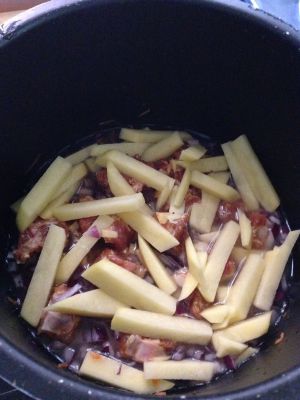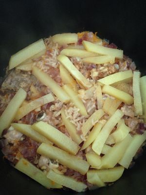 把之前备好的料一层层加在米上,依次为:胡萝卜丝,洋葱丁,排骨,土豆条,然后放进高压锅,按做饭键就等着香气飘满屋吧,哈哈