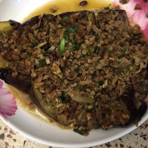茄子烤好剖开放入拌好的肉末上面撒上少许孜然粉,放入烤箱烤5分钟。